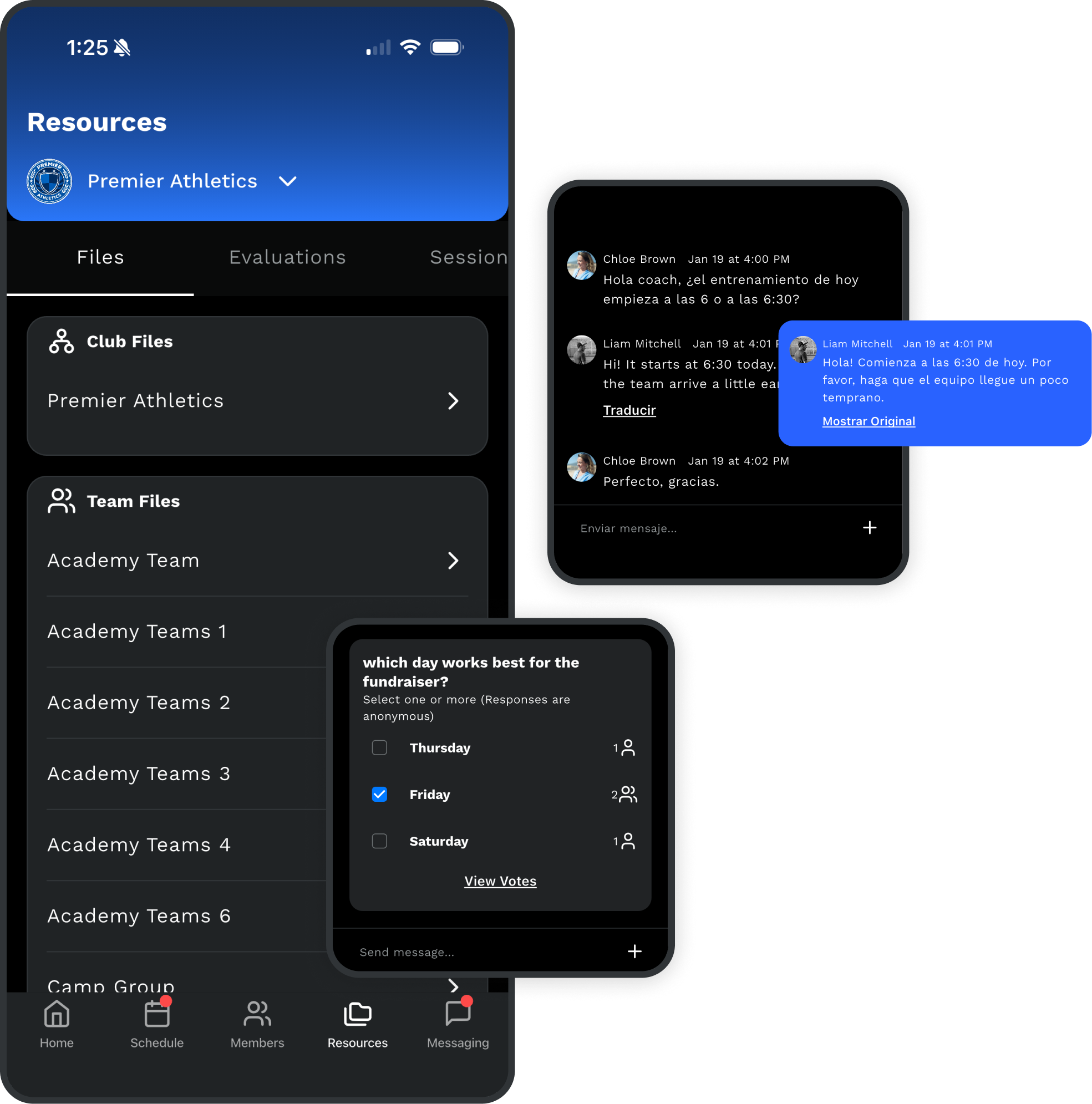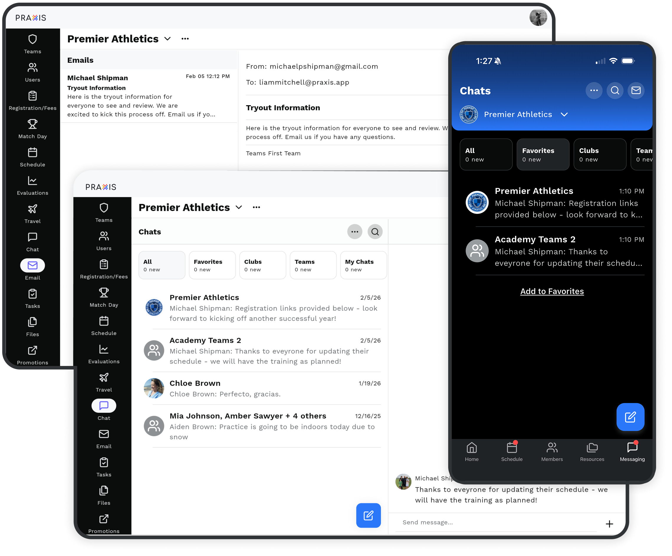Most messaging tools treat conversations as standalone threads. In Praxis, messages are tied directly to teams, events, players, and roles. All communication lives in one centralized hub, keeping messaging organized, efficient, and easy to manage. File sharing and a dedicated admin message board ensure organization-wide communication stays clear and controlled.