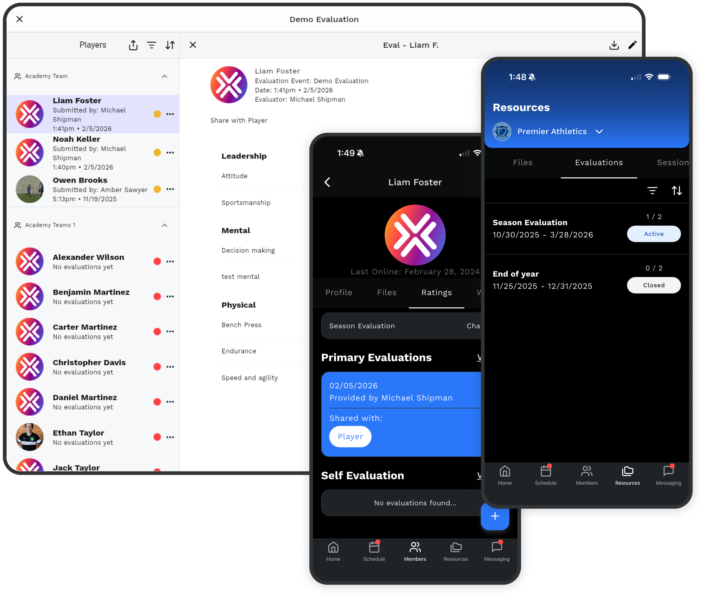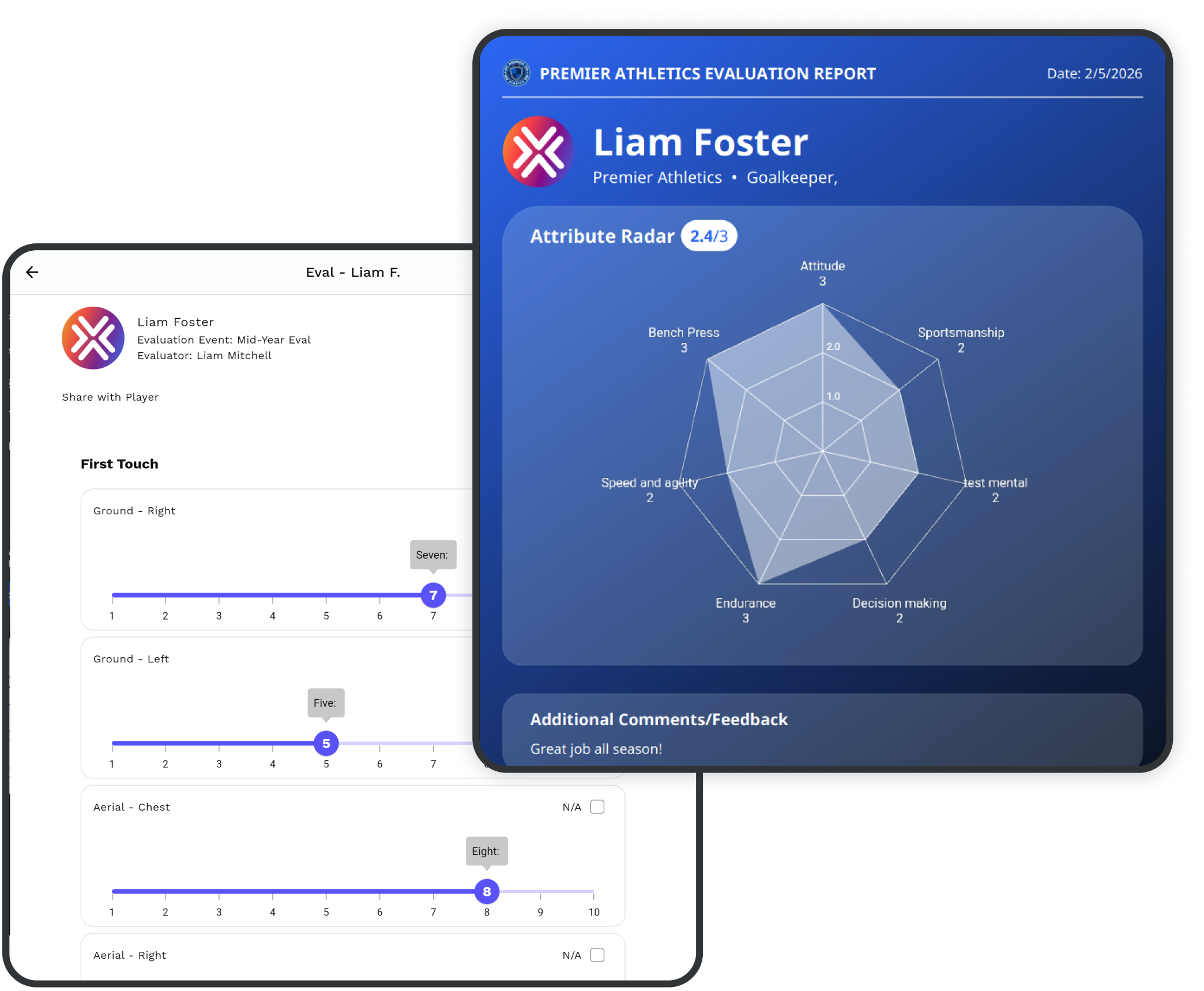 Supports coach evaluations, self-evaluations, and multiple evaluators per player to capture a complete performance picture