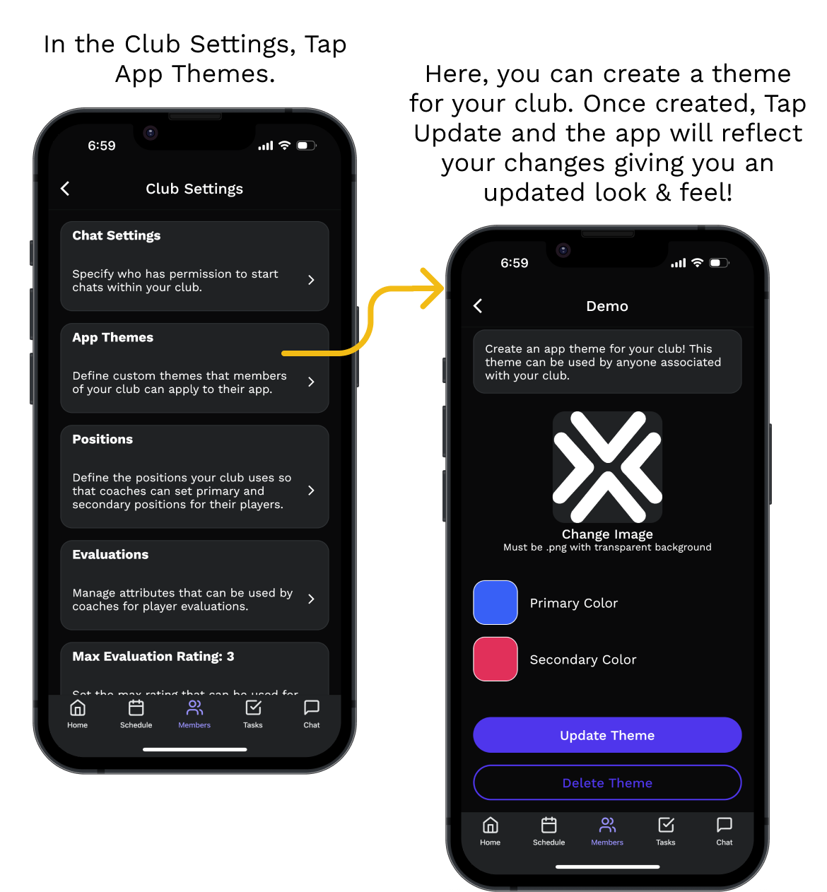How to create an app club theme as an Admin How to switch accounts as a coach How to add an additional team How to create accounts How to create scheduling preferences How to schedule an event How to update attendance How to use chats How to live score games How to quick add game scores How to create new evaluation attributes for a club How to track status of evaluation requests (sent and received) How to request feedback from coaches on specific players How to do primary evaluations for multiple players How to do a primary evaluation for a single player How to add or remove head coach status