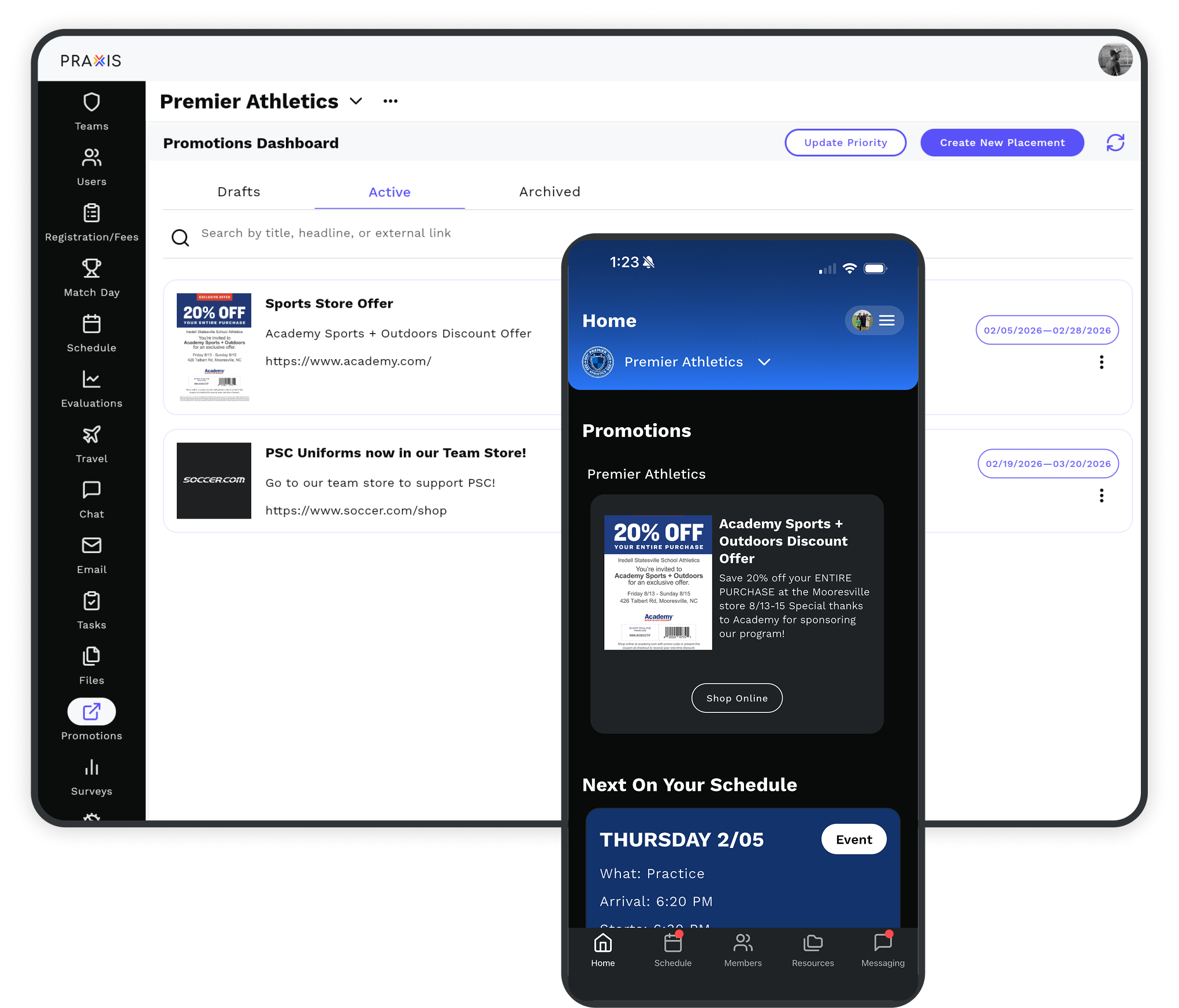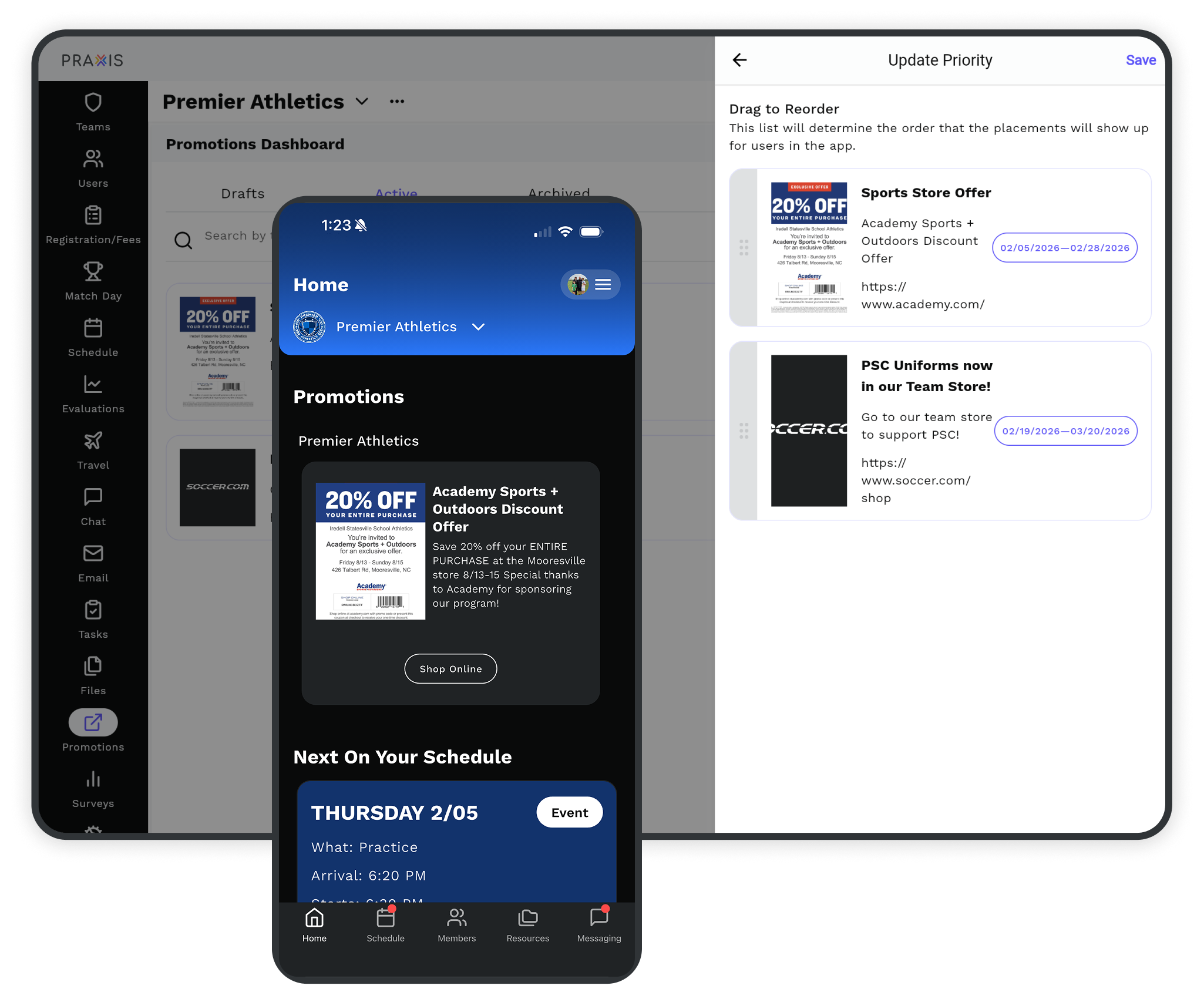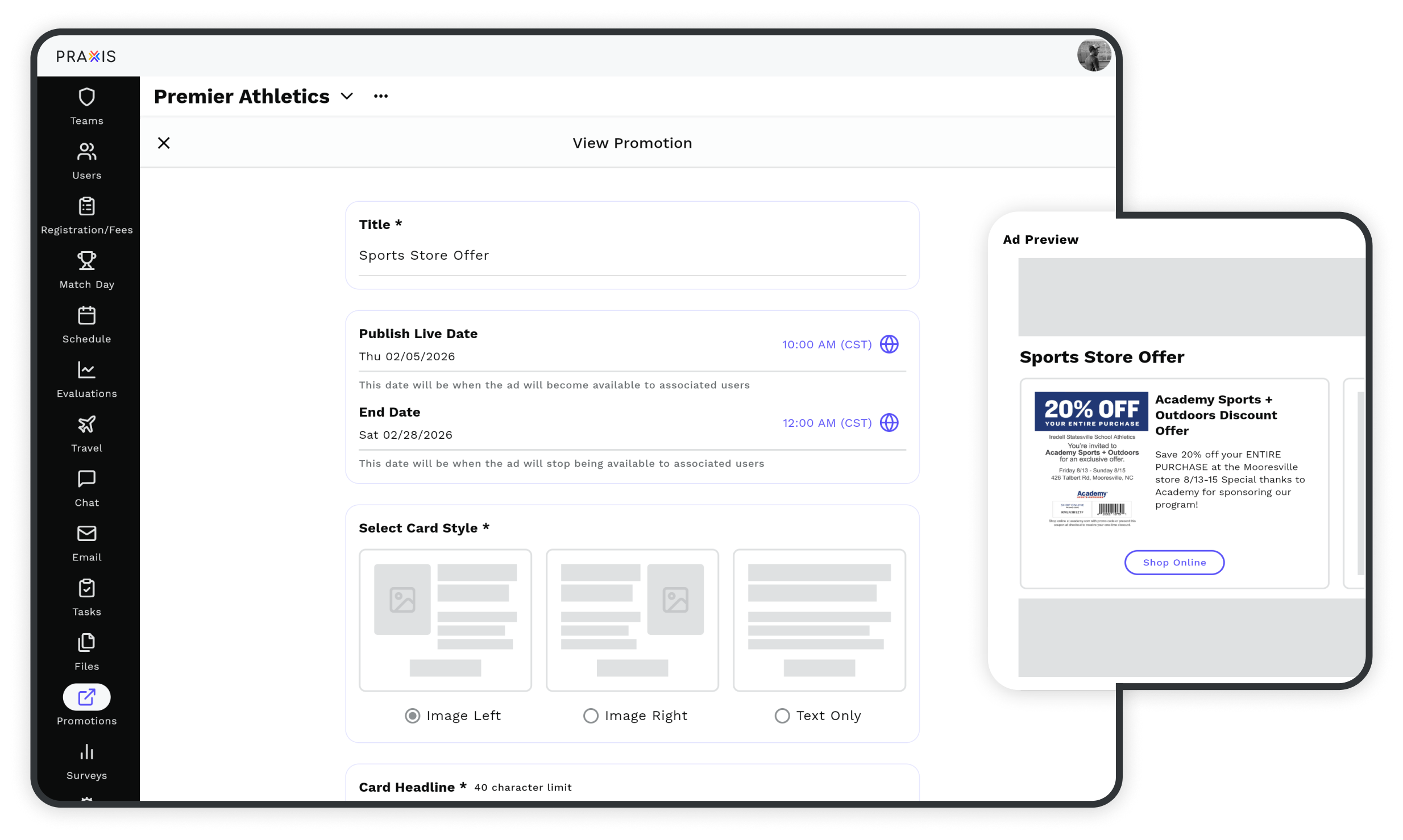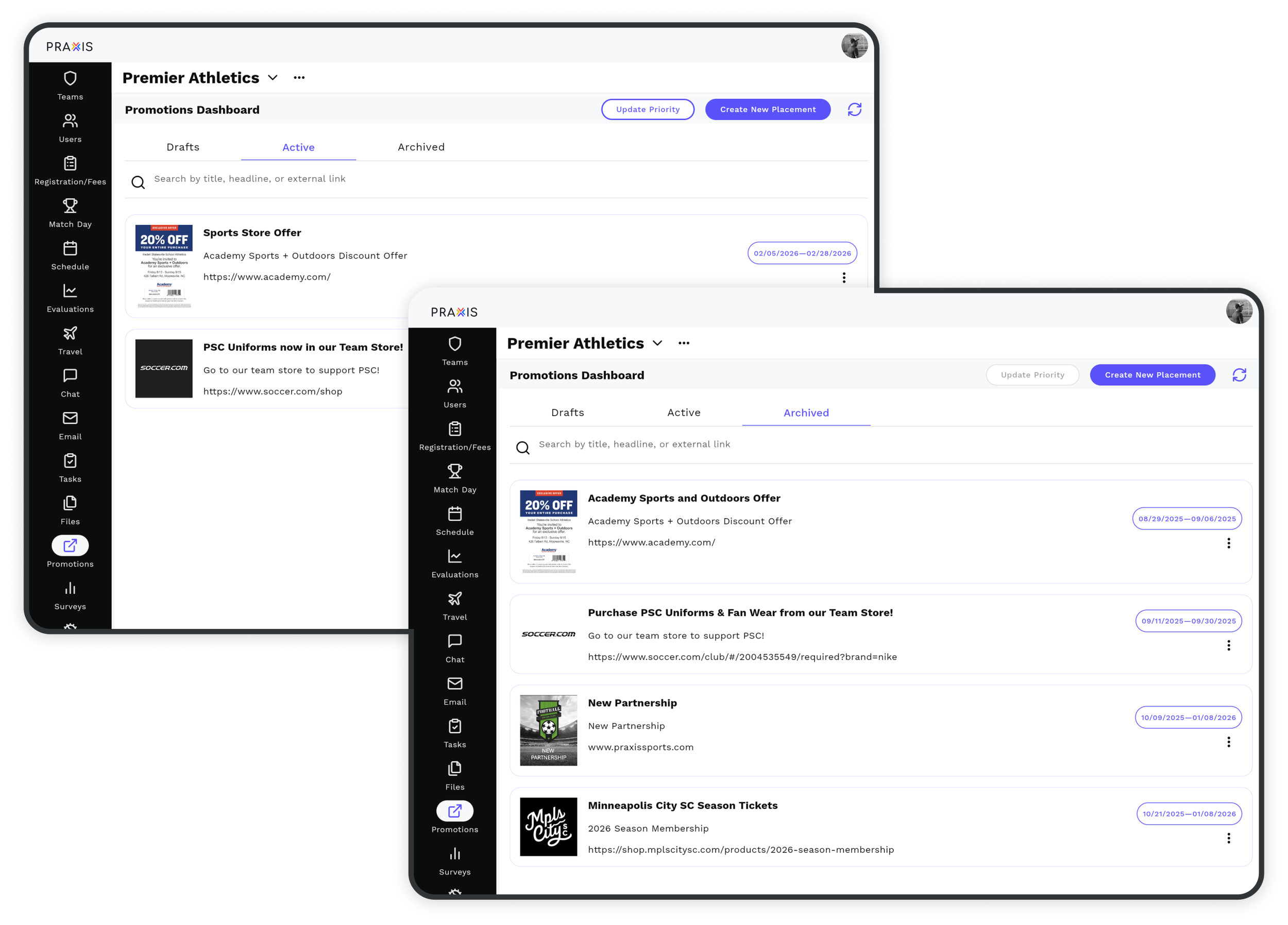 Praxis promotions and sponsorships are designed to help clubs actively manage and execute content they care about, while creating optional monetization opportunities.