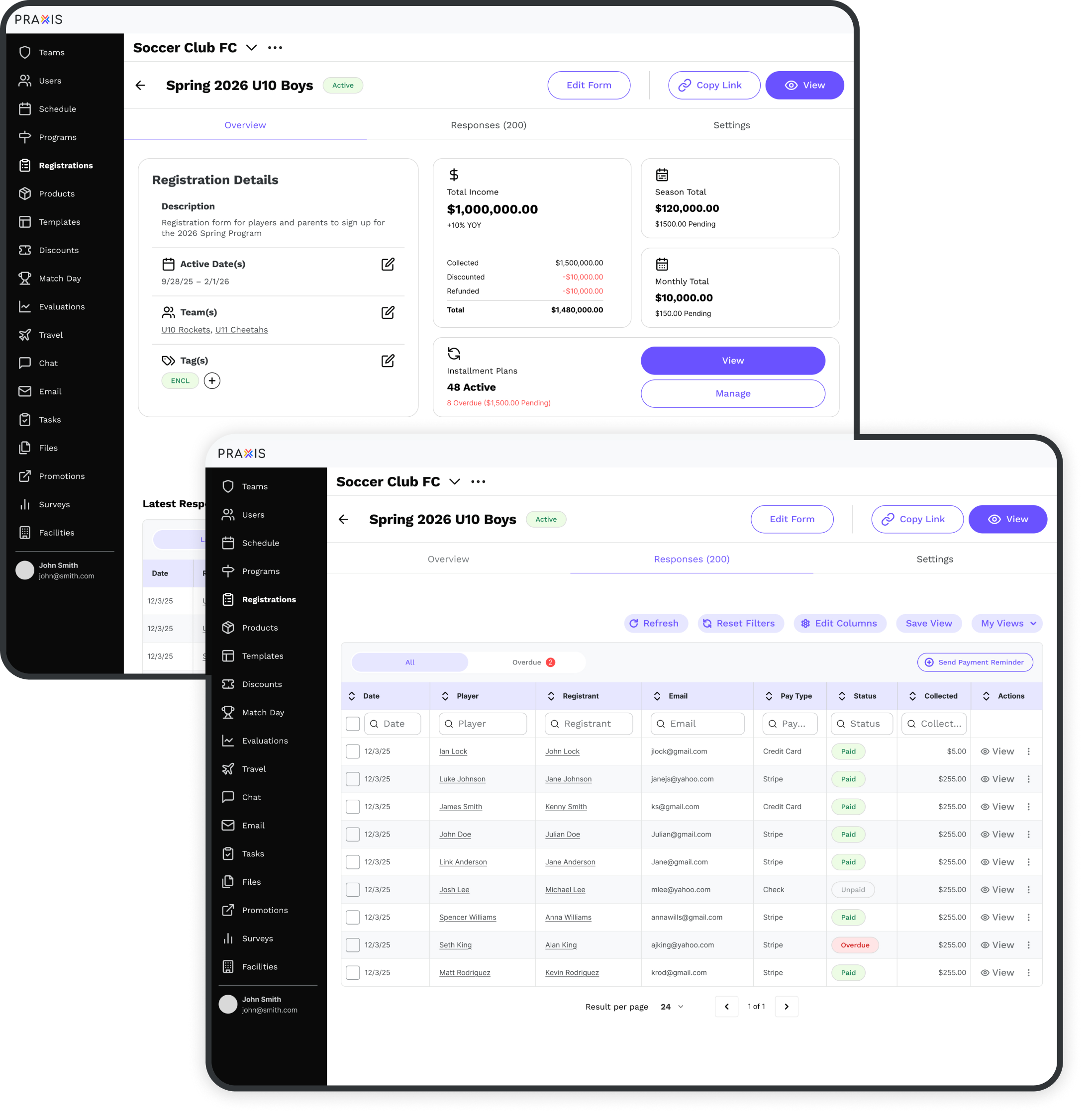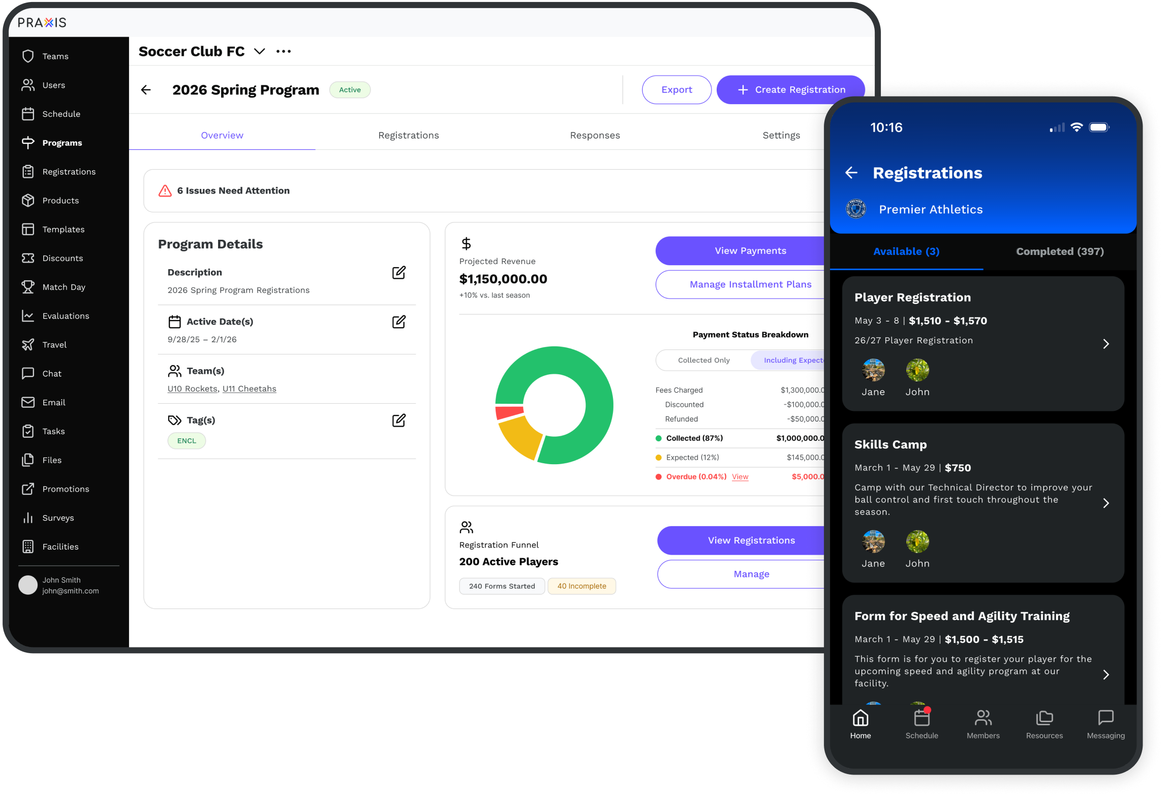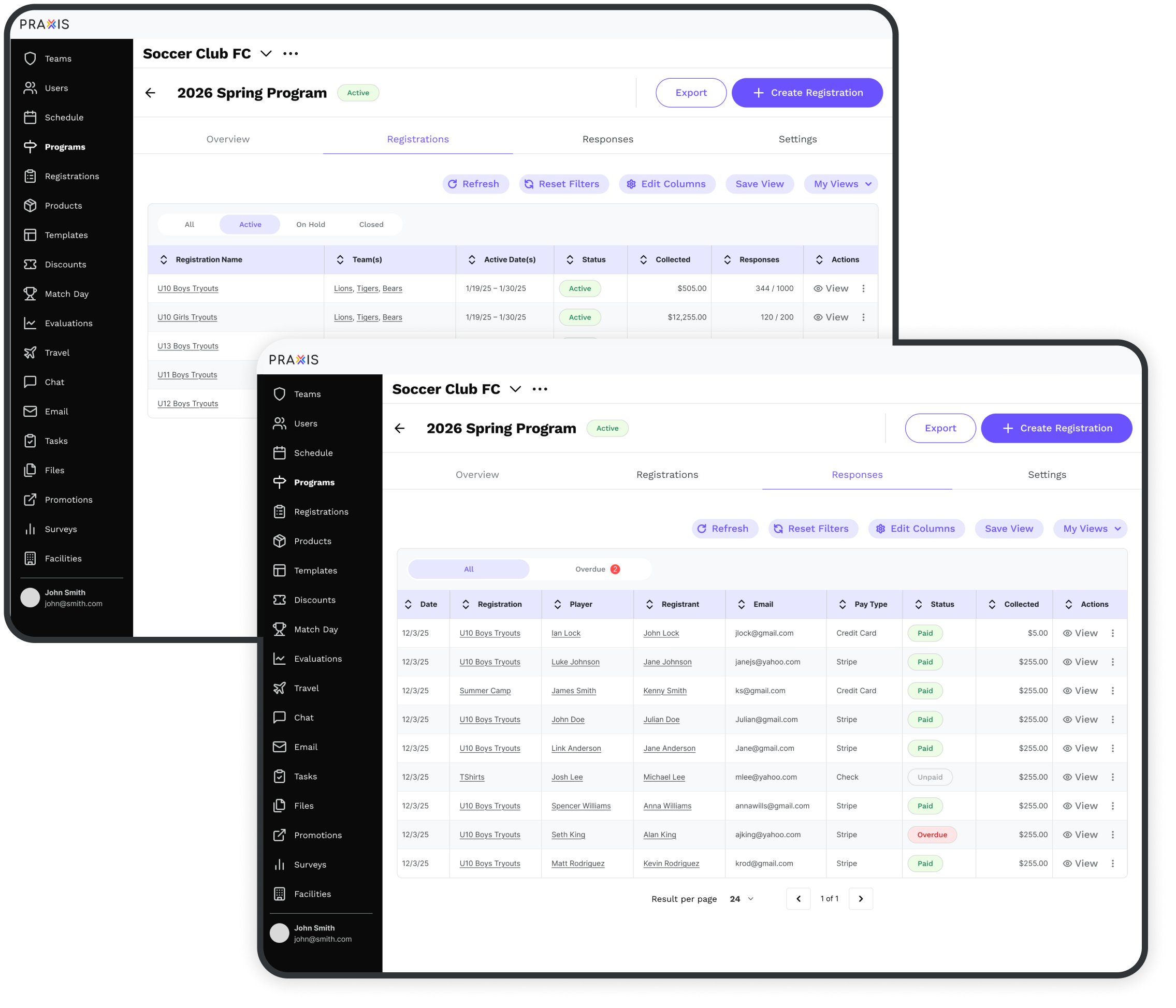One platform for registration, teams, scheduling, payments, and communication—built to keep everything in sync. Get a personalized walkthrough of Praxis for your organization.